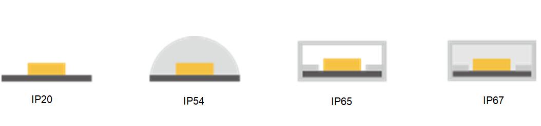 IP20: Non-waterproof; IP54: Single side with glue; IP65: With Silicone Tube; IP67: Silicone Tube + Silicone Glue